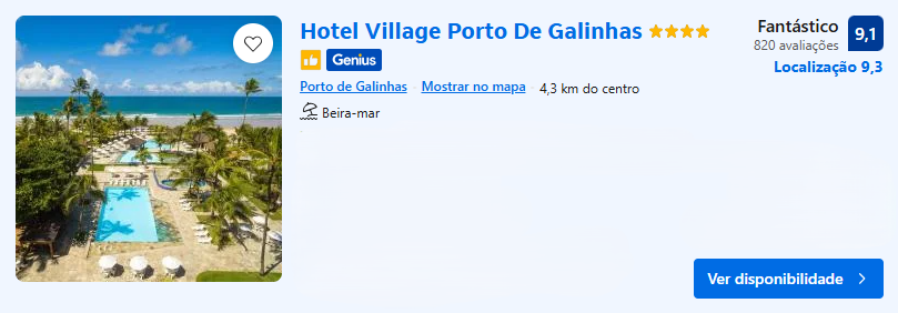 Hotel Village – localizado à beira-mar, em Porto de Galinhas, o Hotel Village é um resort 4 estrelas com jardins paisagísticos deslumbrantes, com piscinas com área de hidromassagem, além de opções gastronômicas coberta e ao ar livre.